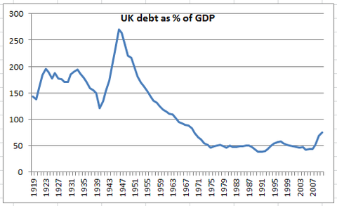 In Gran Bretagna, patria di Keynes e assieme agli Usa uno dei due pilastri del sistema economico e monetario del tempo, il debito pubblico viaggiava al di sopra del 150% del Pil, come Krugman ha fatto presente in un post sul suo blog (da cui è tratto il grafico seguente):
